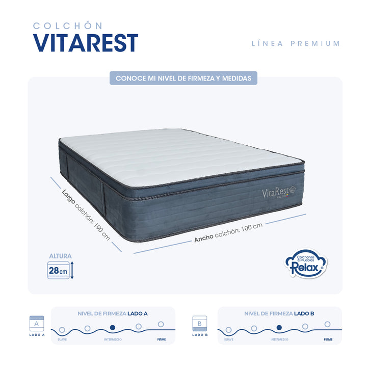 Colchón Resortado Relax VitalRest Con Pillow Firmeza Intermedia Confortable Con Pillow Top Tamaño Sencillo 100x190x28cm.Gratis Protector de Colchón