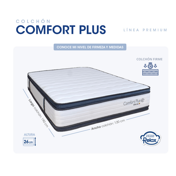Combo Colchón Relax Extra Firme Confort Plus Con Pillow Top Tamaño Semidoble 120x190x26cm Sistema High Care + Base cama Entera Madera 100% inmunizada Anti-Plaga. Gratis Protector de Colchón